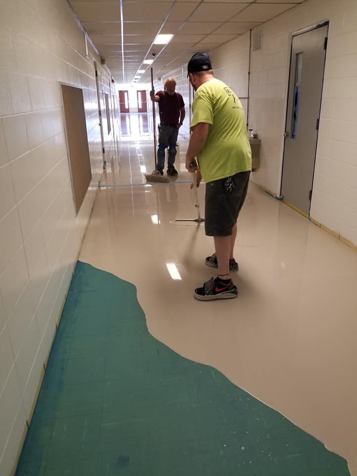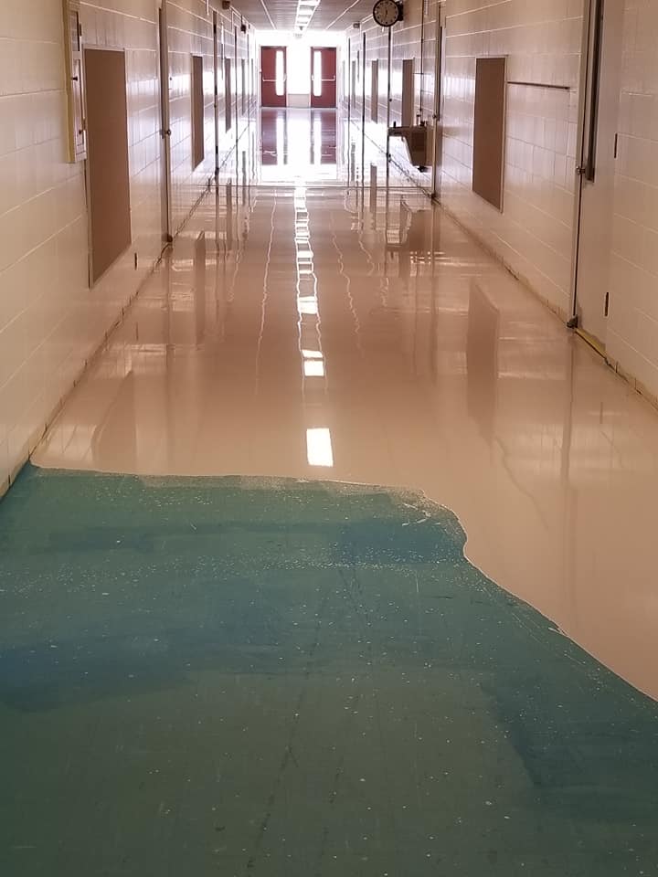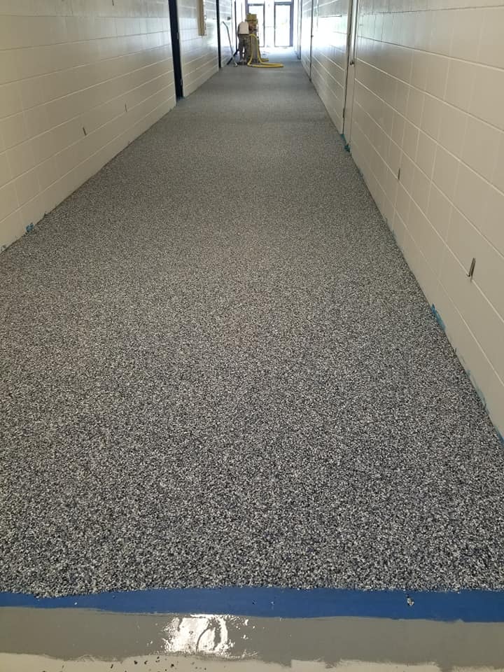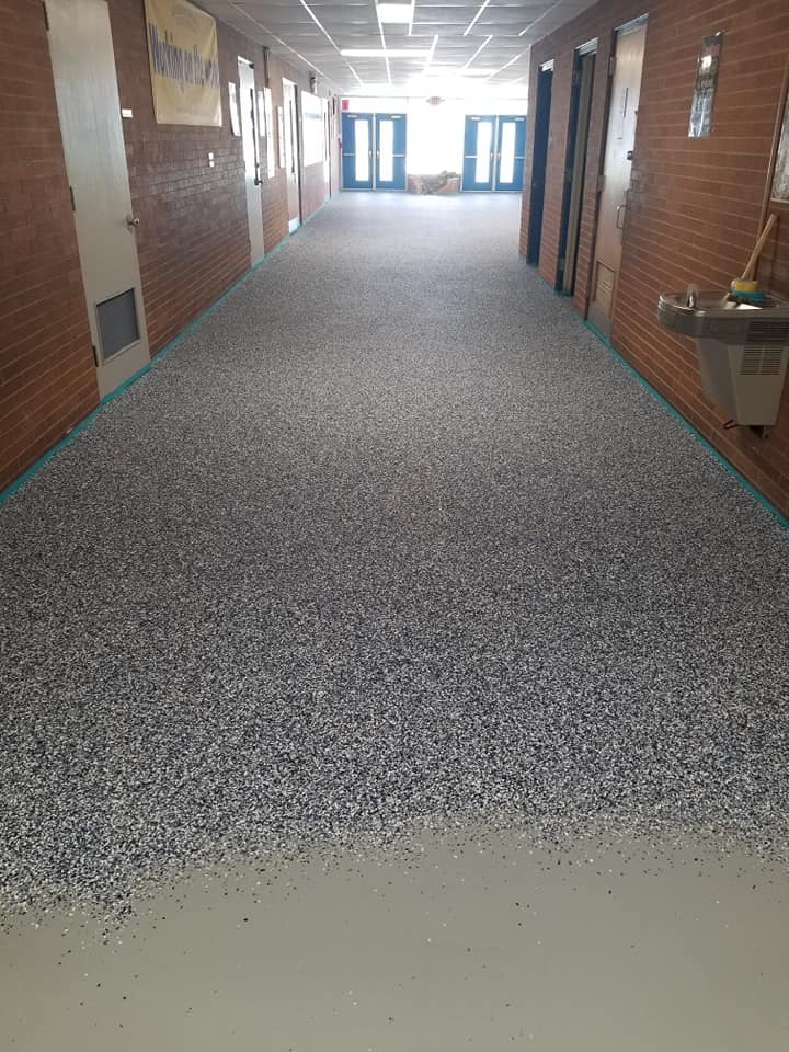 Solution: Hightech Performance Coatings encapsulated the V.A.T. with a synthetic gypsum overlay system with a 10 year warranty from the manufacturer. A decorative flake floor matching school colors was installed revitalizing the entire building into beautiful high wear flooring system with minimal maintenance requirements.